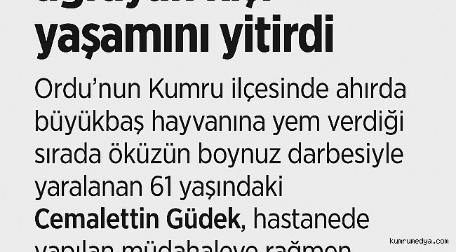 Kumru ilçesine bağlı Kayabaşı Mahallesi’nde meydana gelen olayda, sabah saatlerinde ahırında hayvanlarını beslemeye çalışan 61 yaşındaki Cemalettin Güdek, talihsiz bir kaza sonucu yaşamını yitirdi.